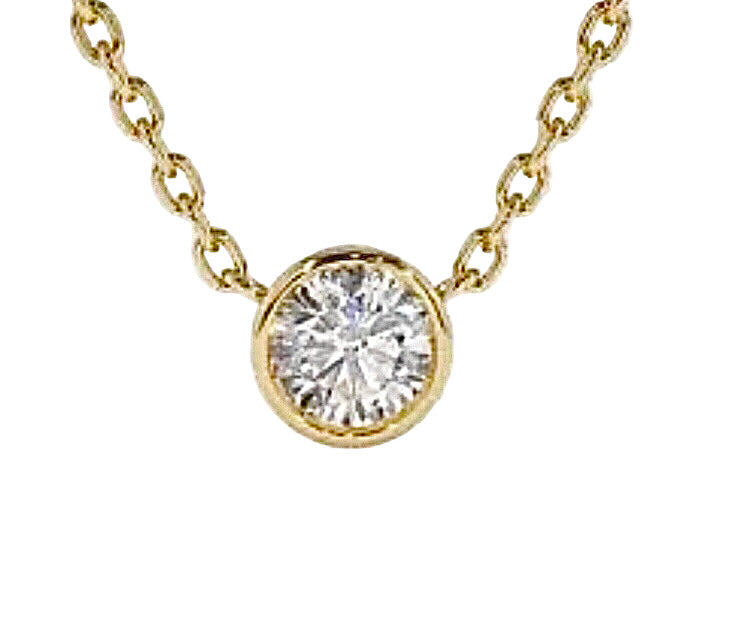 A modern pendant showcasing a round diamond in a sleek bezel setting for timeless simplicity. IGI CERTIFIED