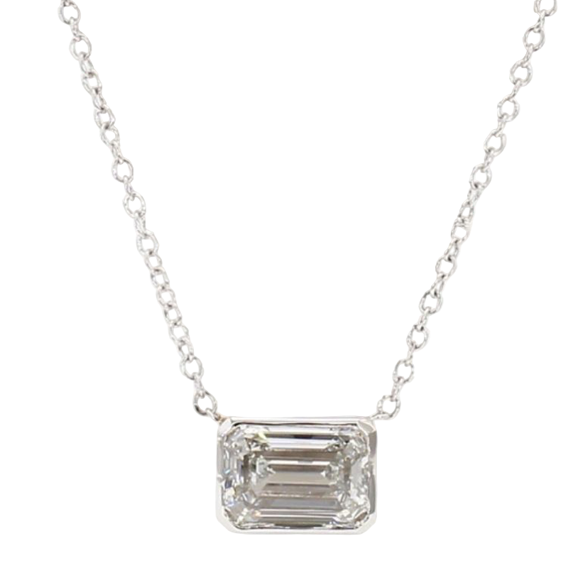Sophisticated necklace featuring bezel set emerald diamond. IGI CERTIFIED